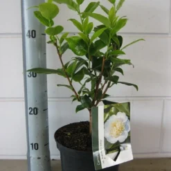 Camellia japonica ‘Brushfield’s Yellow’ (camelia) bloeit met witte bloemen, met een gevuld zachtgeel hart. Deze camelia bloeit rond maart-april. Het stevige blad is donkergroen en glanzend. Camelia’s zijn groenblijvend.