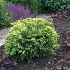 Deze conifeer dankt zijn naam aan de gele kleur die over de groene plant ligt. Het is een cultivar van een Lawsons dwergcipres afkomstig uit Californië. Breed uitgroeiend, hoogte in 10 jaar: 75 cm. Ook geschikt voor kleine tuinen.